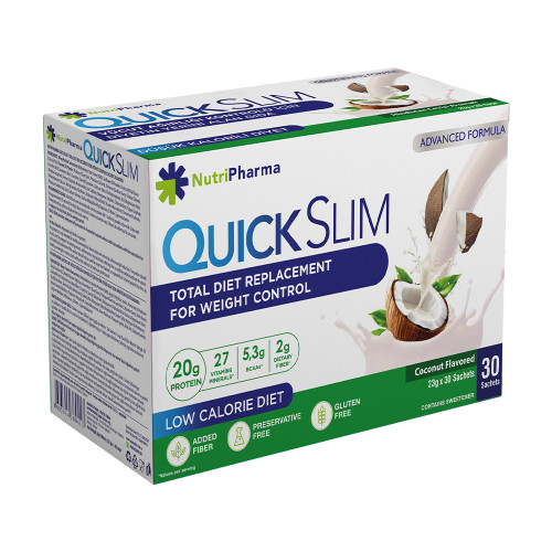 Харчова добавка Quick Slim – це повноцінний раціон на основі концентрату сироваткового протеїну для тих, хто прагне тримати вагу під контролем. Сироватковий протеїн допомагає зберегти м'язову масу під час схуднення навіть у тих людей, які не займаються спортом. Він має здатність засвоюватися організмом практично на 100%, завдяки чому є одним із найкращих джерел білка. Крім того, він містить всі незамінні амінокислоти, які організм не здатен виробляти самостійно, а повинен отримувати із їжі. Інулін у складі добавки прискорює спалювання жиру та вважається пребіотиком завдяки своїм здібностям підтримувати розмноження корисних бактерій у кишечнику. Олія льону здатна розщеплювати жири, виводити з організму токсини та покращувати роботу кишківника. Клітковина допомагає продуктам харчування швидше виводитися травною системою, запобігаючи газоутворенню. Коктейль Quick Slim має приємний кокосовий смак. Містить підсолоджувачі. Не містить глютену, консервантів і шкідливих для здоров’я речовин.