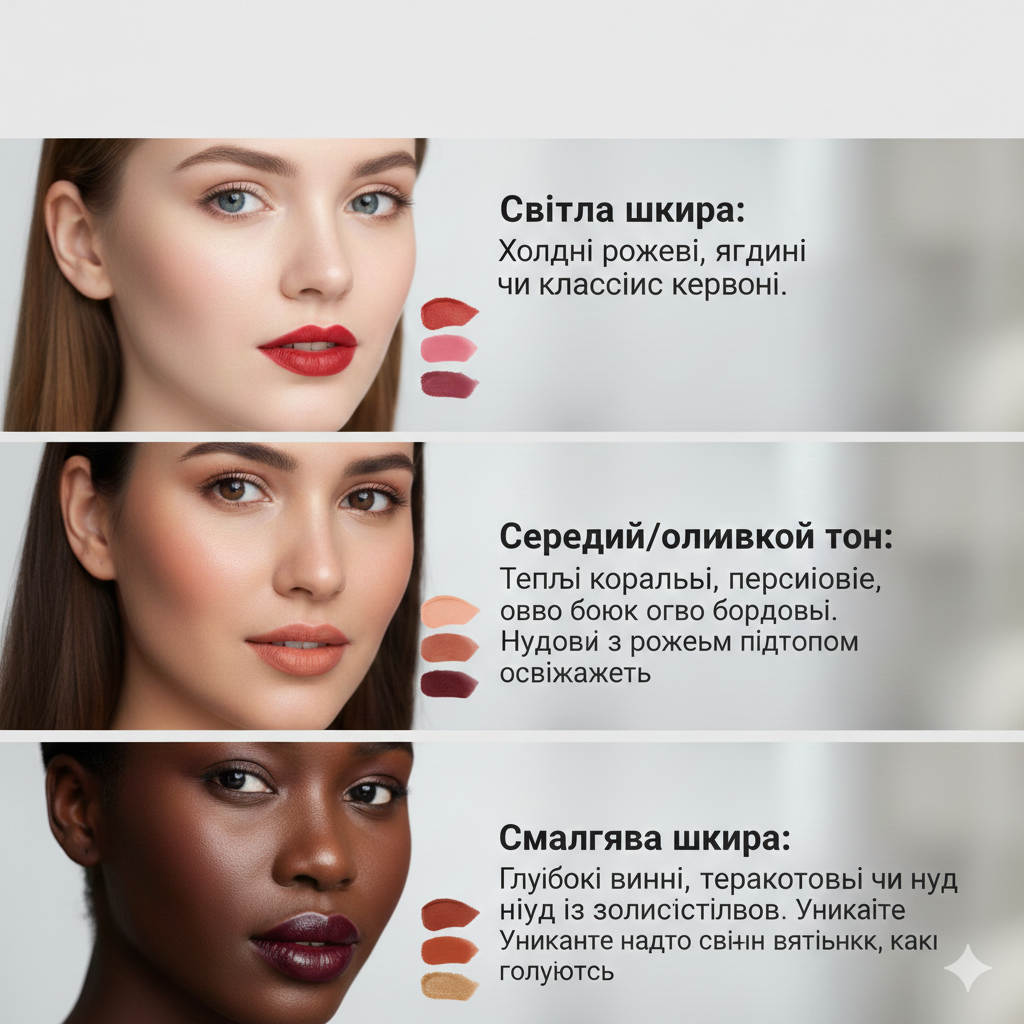 - Світла шкіра: Холодні рожеві, ягідні чи класичні червоні. Уникайте надто темних сливових, бо вони можуть додати втоми.