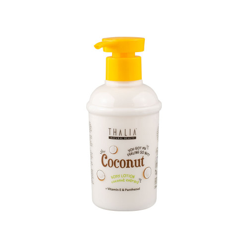 Лосьйон для тіла THALIA з винятковою текстурою ніжного суфле буквально тане на шкірі! Екстракт кокоса відомий своєю пом'якшуючою дією. Цей корисний компонент відчутно підвищує пружність і тонус шкіри. Особлива формула лосьйону THALIA доповнена двома омолоджуючими компонентами: вітаміном Е, який інтенсивно зволожує шкіру та уповільнює її старіння, і пантенолом, що регулює обмінні процеси та пришвидшує синтез власного колагену. Продукт забезпечує вашу шкіру необхідною вологою та глибоко живить її. Легка консистенція лосьйону швидко поглинається шкірою. Не містить парабенів, парафінів і шкідливих для здоров'я речовин.