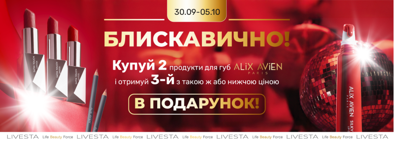 - В пропозиції беруть участь продукти для губ Alix Avien зі с.98-103.